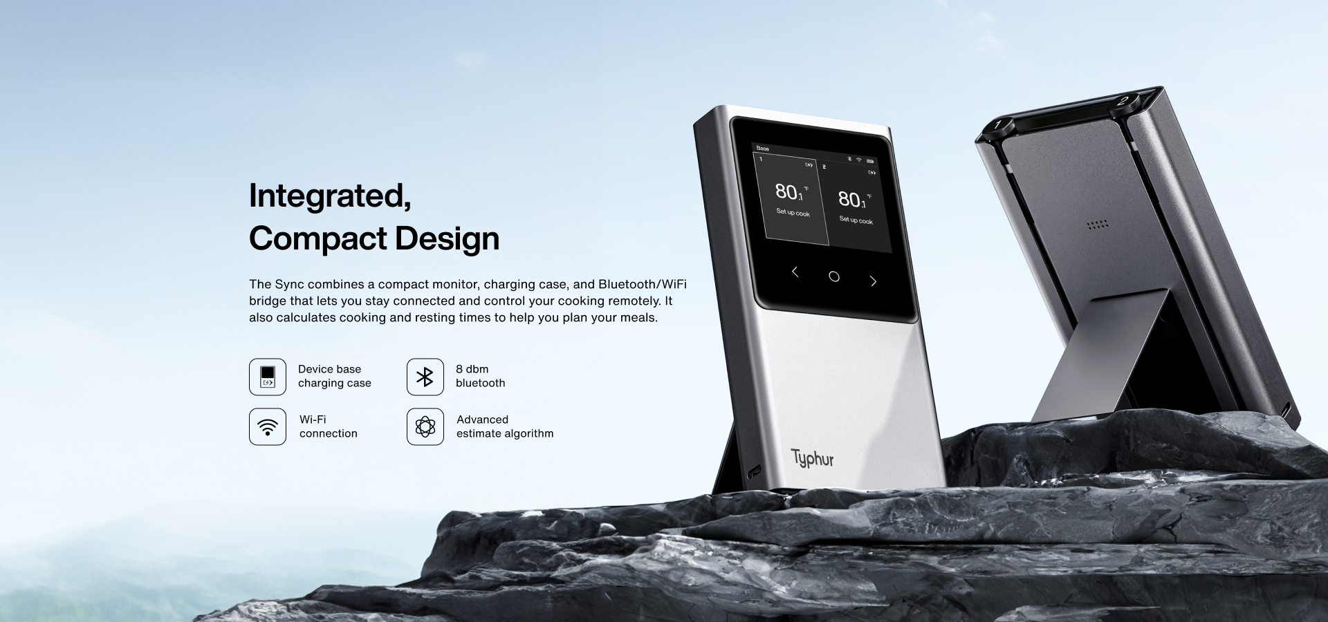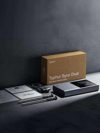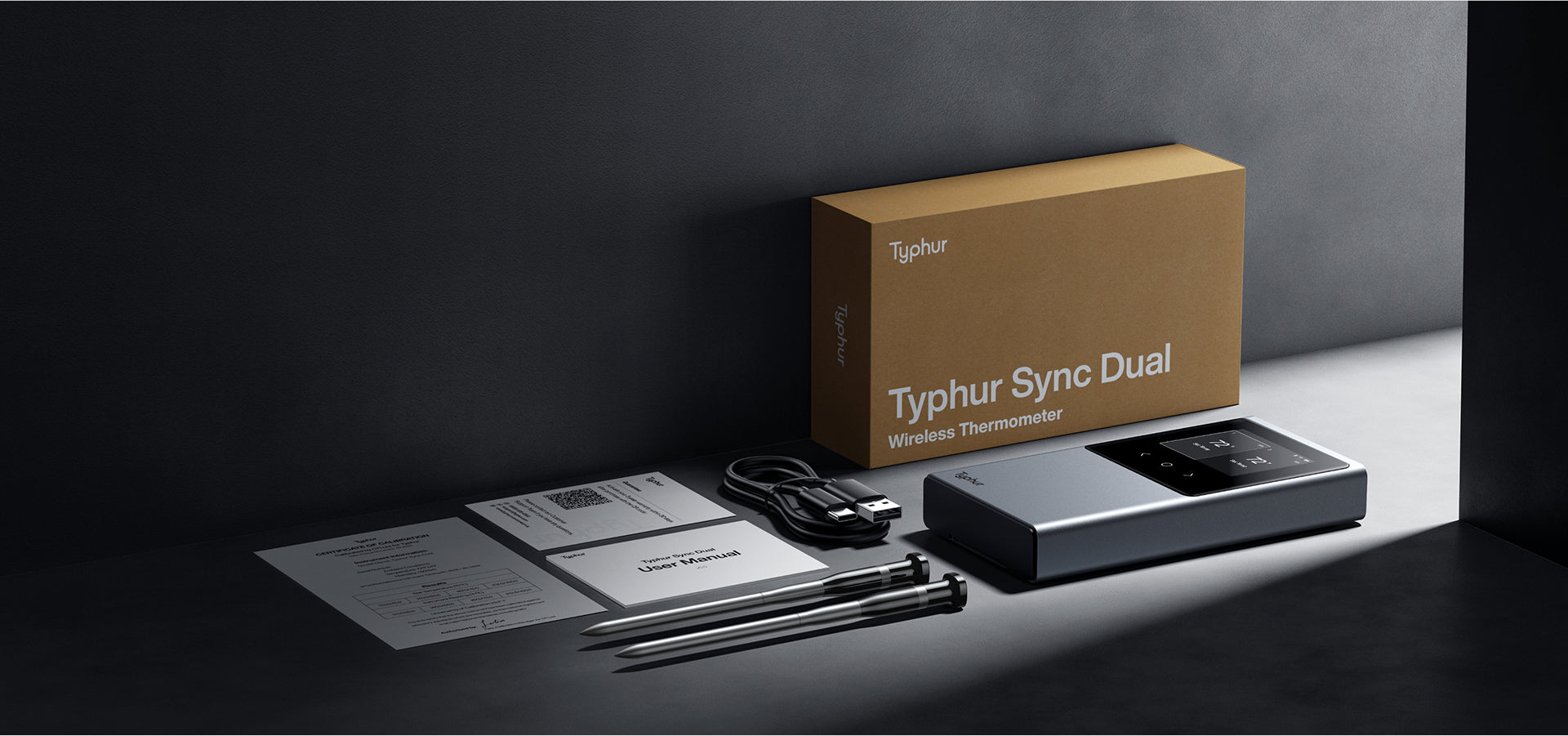 The Typhur Sync wireless thermometer comes with the following: Typhur Sync Device Base with 2 Probes USB-C charging cable Manual Warranty Card