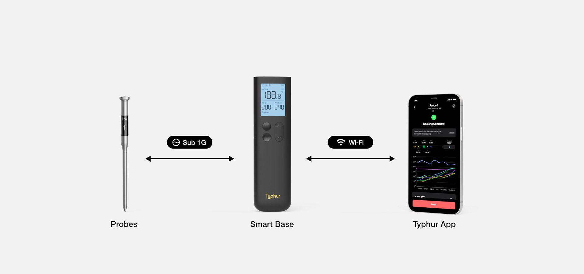The Device Base can work as a temperature screen, a Probe charging case, and a WiFi & Bluetooth bridge. The temperature estimate algorithm is embedded.